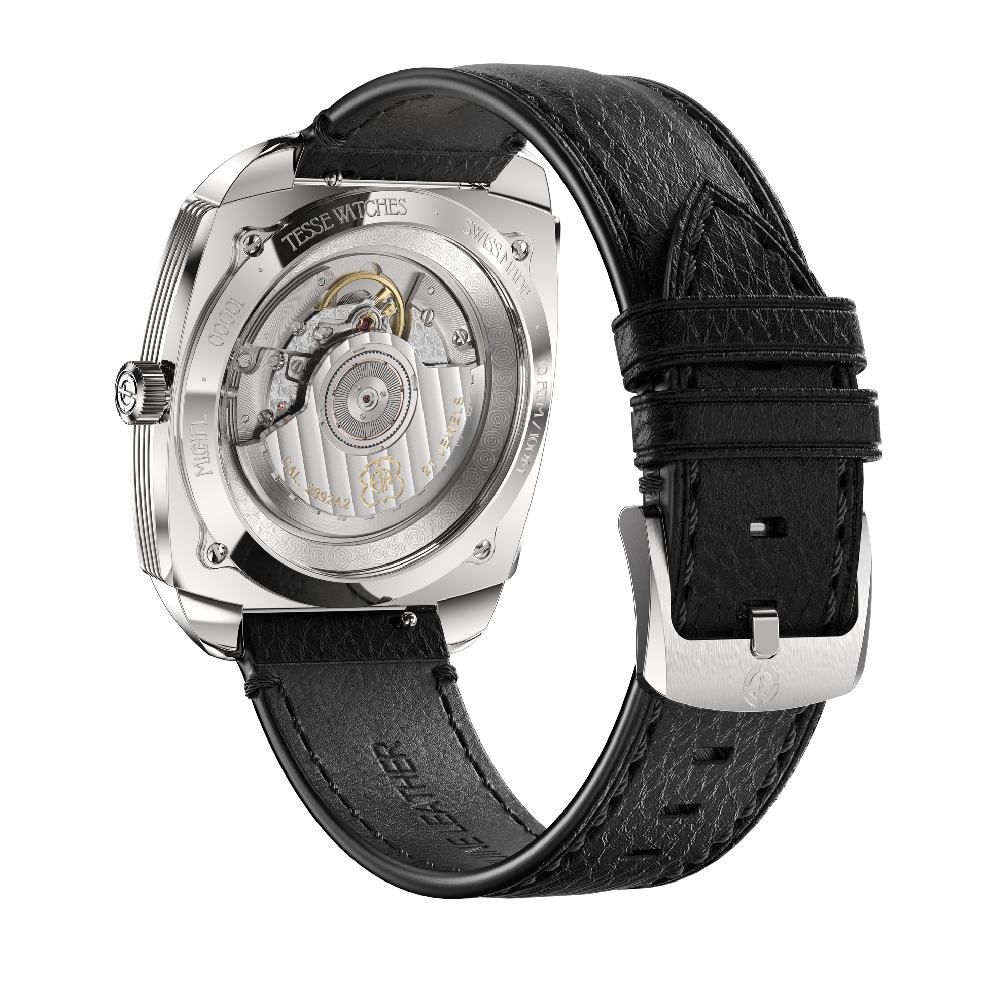 At the heart of the Architect is the ETA 2892-A2 in Elaboré grade — a Swiss automatic calibre celebrated for its slim profile and enduring reliability. Ticking at 28,800 bph (4Hz), it features 21 jewels and a 50-hour power reserve, balancing technical precision with refined finishing. The movement’s elegance is revealed through the oversized sapphire caseback, where its decoration can be admired alongside Tessé’s custom-engraved movement holder — a detail that anchors the watch’s architectural identity.