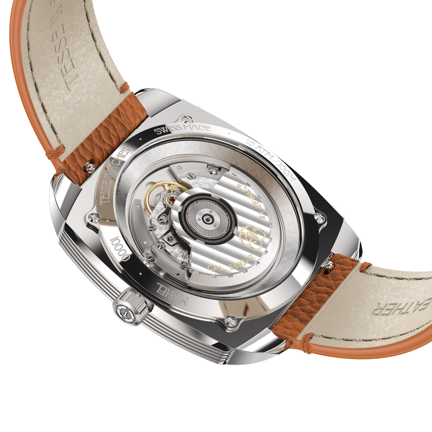 At the heart of the Architect is the ETA 2892-A2 in Elaboré grade — a Swiss automatic calibre celebrated for its slim profile and enduring reliability. Ticking at 28,800 bph (4Hz), it features 21 jewels and a 50-hour power reserve, balancing technical precision with refined finishing. The movement’s elegance is revealed through the oversized sapphire caseback, where its decoration can be admired alongside Tessé’s custom-engraved movement holder — a detail that anchors the watch’s architectural identity.