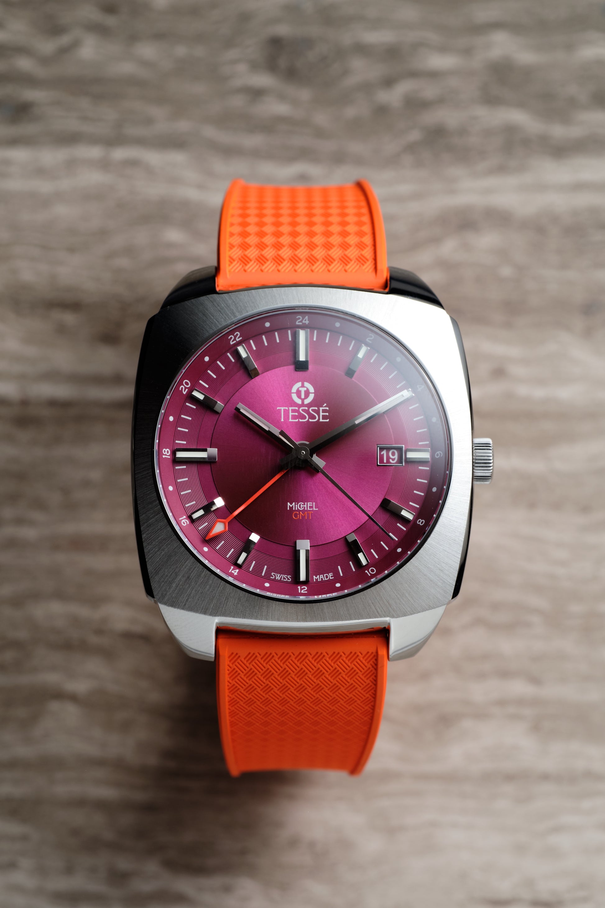 The "Michel GMT" offers a contemporary reinterpretation of a 1970s design. With a 40mm case blending elements of a tonneau and a cushion, it boasts intricate mirror polishing and a sunray radial brush. The generously sized dial incorporates various textures, featuring a radial brush in the center, a satin ring, and etched patterns on the outer ring. Large applied indexes and distinctive mountain-cut hands pay homage to 1970s timepieces, captivating light at different angles and creating an ever-changing aesthetic.